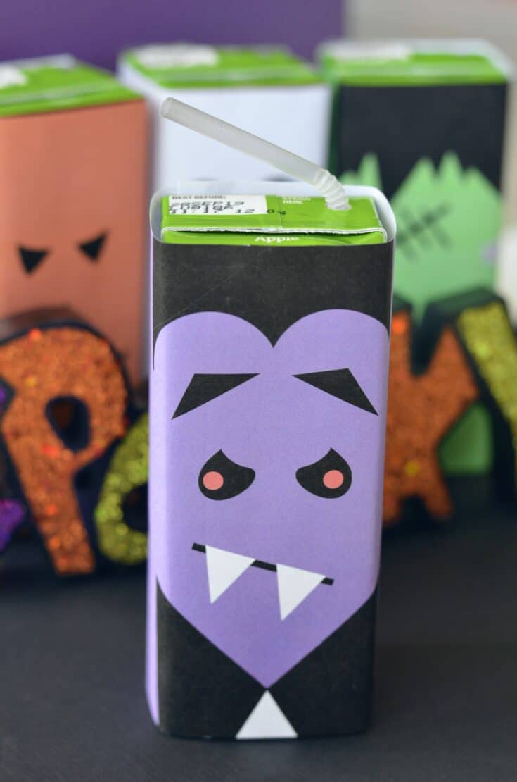 Printable Halloween Juice Box Covers | Skip To My Lou Download the free printable juice box covers. Print with no scaling in color on regular copy paper. Printable Halloween Juice Box Covers Frankenstein and Dracula Pumpkin and Ghost Cut out the covers and wrap around the juice box. A tape roller works great for sticking the ends of the paper together.