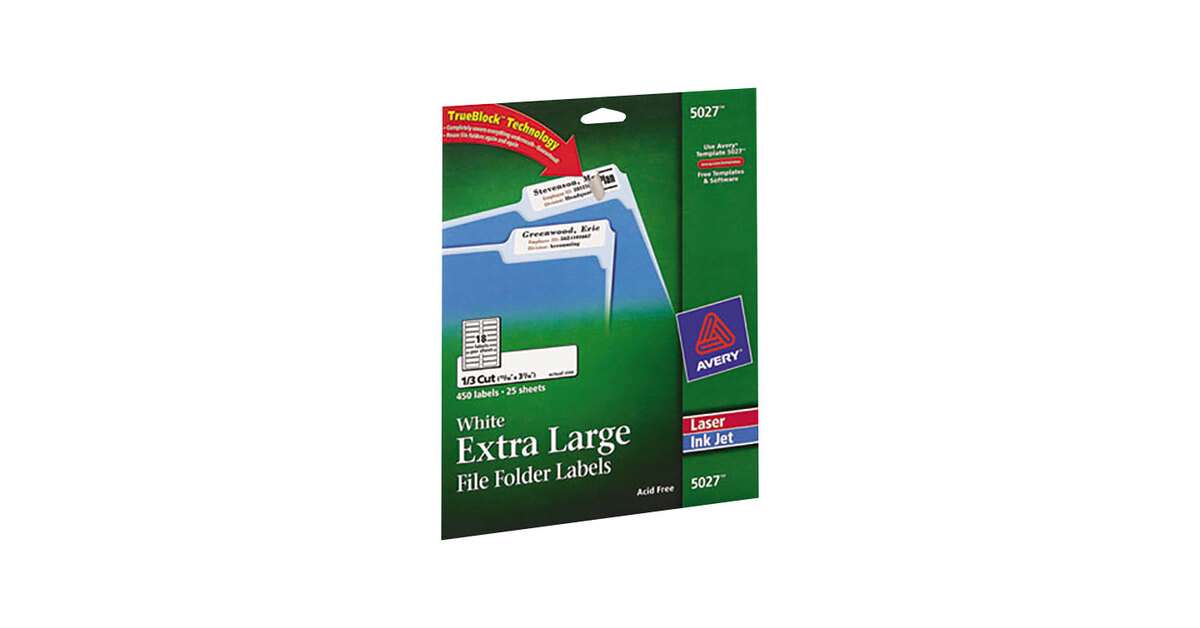 Avery® 2327 - File Folder Labels , 3½" x ⅓, Rectangle, White with TrueBlock™ Technology for Laser and Inkjet Printers, 3-7/16" x ⅔". 5066. $27.49. Avery ® File Folder Labels. for Laser and Inkjet Printers, 3½" x ⅓". 2326. $2.89. Avery ® Filing Labels. with TrueBlock™ Technology for Laser and Inkjet Printers, ⅔" x 3-7/16".